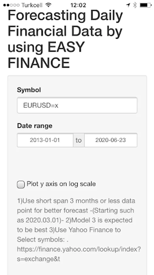 Easy-Finance gives you quick access to all finance data and forecasts for the next day. Three models appear in the application. The first model is obtained by expecting that the next day will be bad. The second model is obtained with signals that the next day will be good. The third model provides its forecasts with the assumption that the next day is a normal day. We can call it bad scenario, good scenario and standard normal scenario, respectively. In addition, if you think that the market dynamics have changed while obtaining the forecasts, you can choose a short date for the predictions of the model from the date section. In this sense, easy finance is an application that will help you follow the market and make the right decisions. Easy Finance uses Yahoo Finance codes to process data.