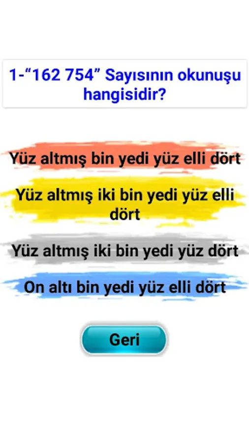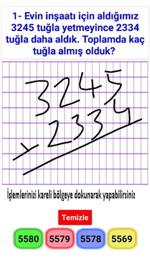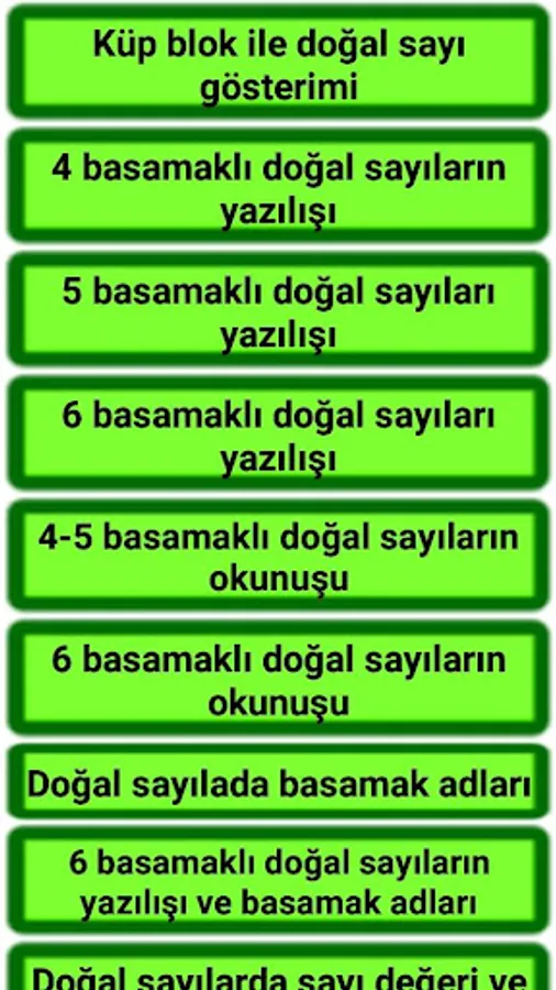 The app has all 4th Grade math topics. In practice, the test is less and most of the activities are intended to be deliberate by entering the results with the keyboard. The four operations and Measure conversions (time-length-liquid-weight) are unlimited. There are 10 questions in each section, when 10 questions are solved correctly, the button color changes and is saved only on your phone. The correct number appears for unlimited transactions and is saved only on your phone. It can be done in the form of a competition with friends.