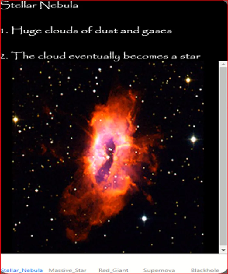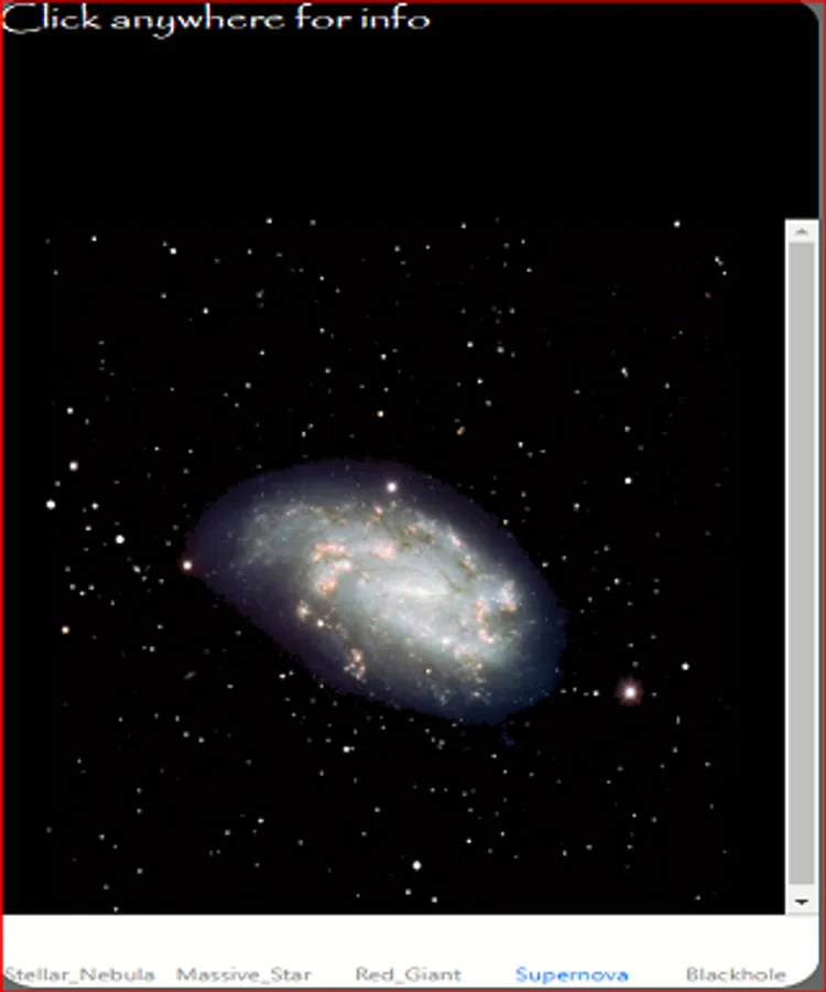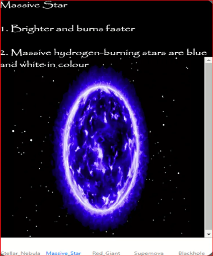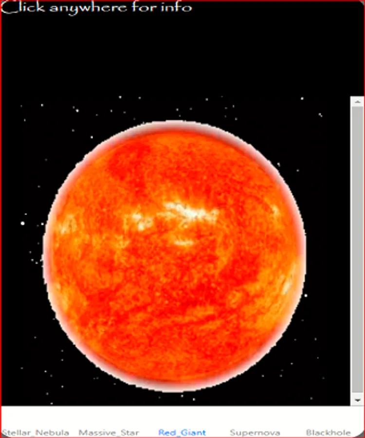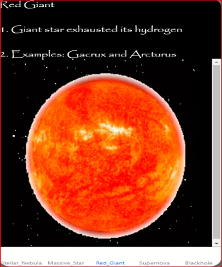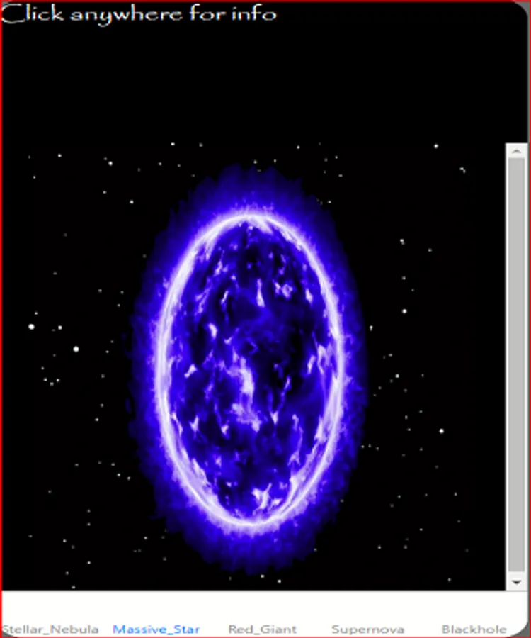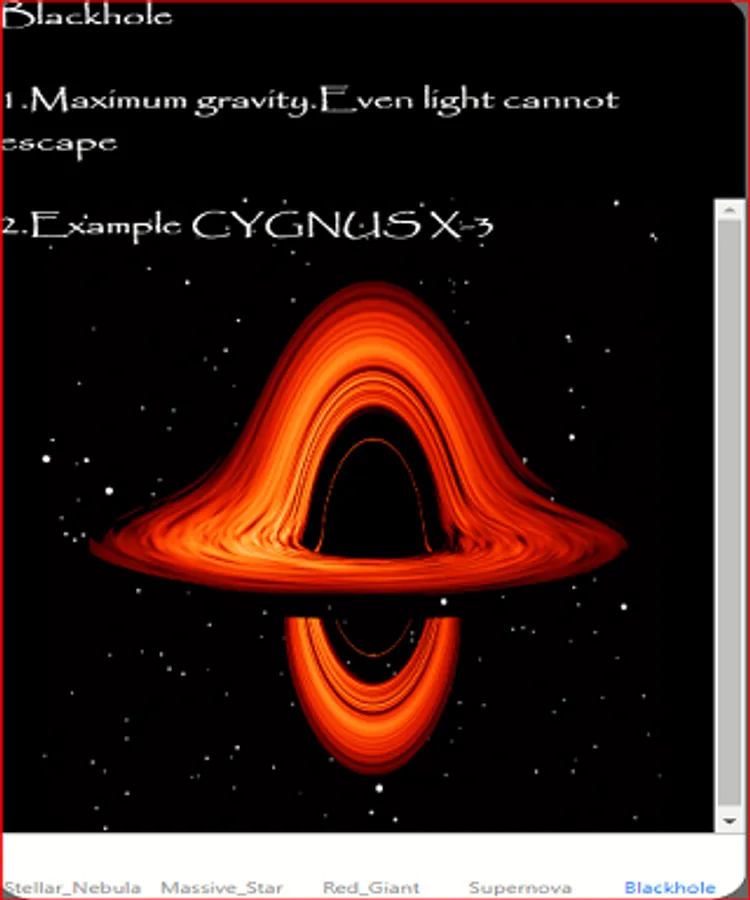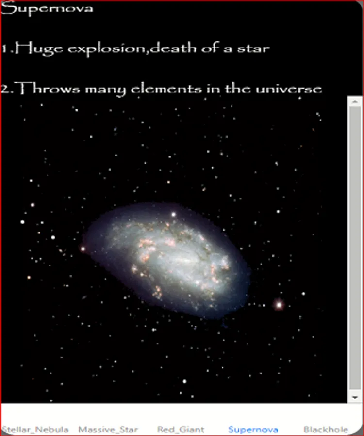 This app is based on the Life cycle of stars. This app will help you to know about the different forms of a star. Click on the picture to know about stars. I hope you will gain some knowledge about stars in this app. Enjoy!!!