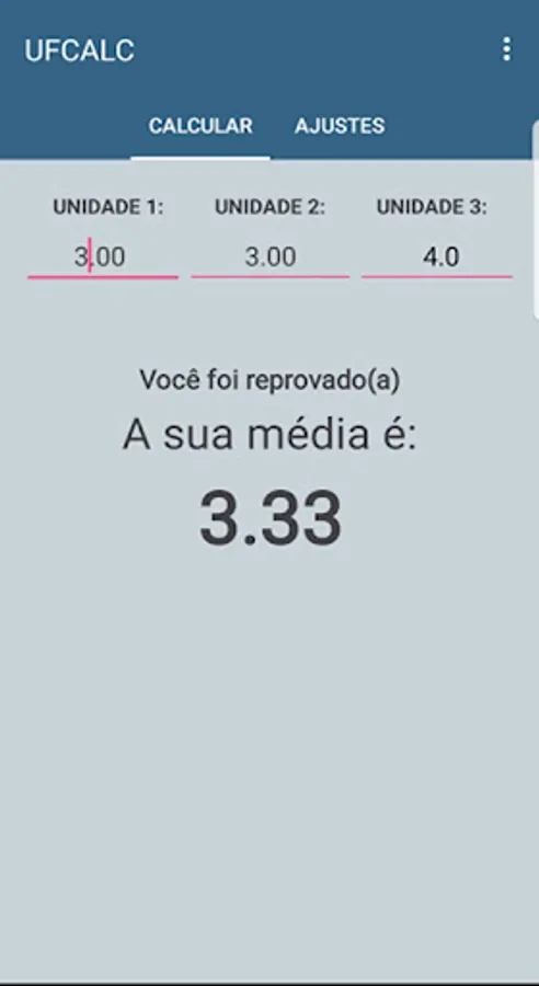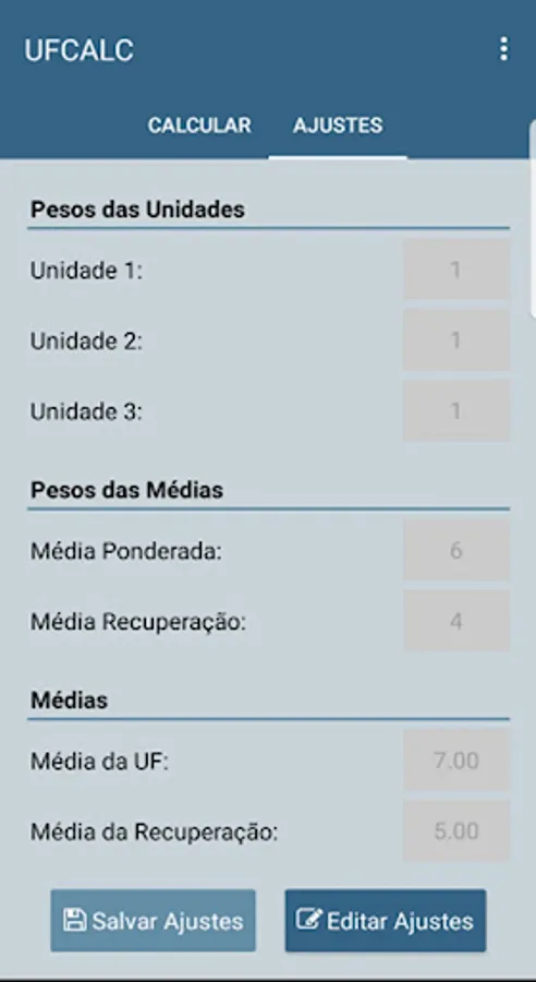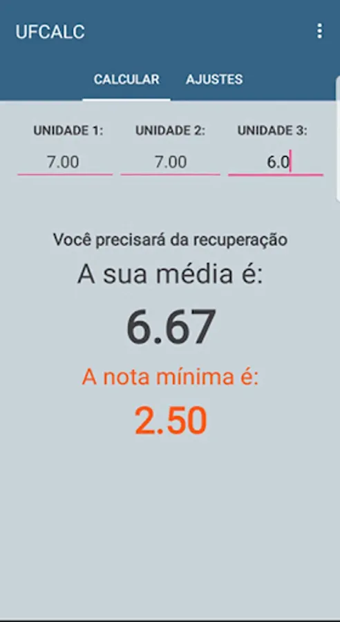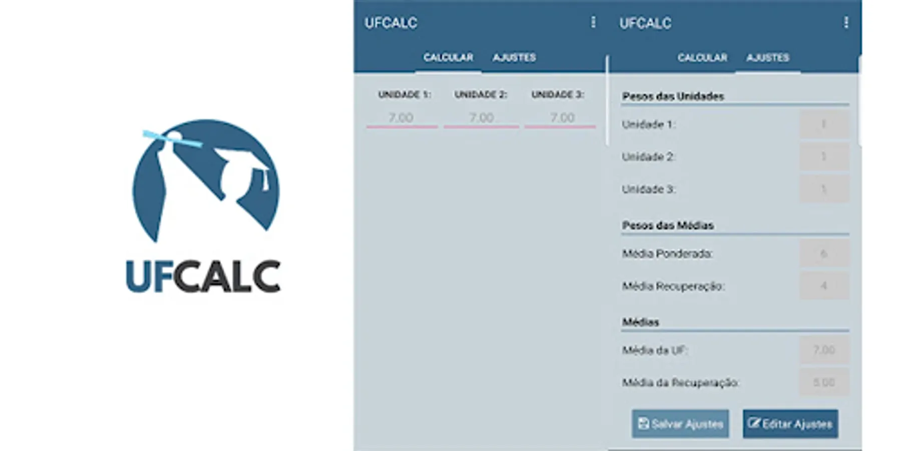 The UFCALC application's main purpose is to calculate and organize your situation in each discipline. With it, you will be able to know how much is left to pass the average in the school period, or how much you need in the final exam. Grades are calculated in a weighted manner.