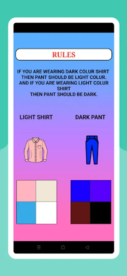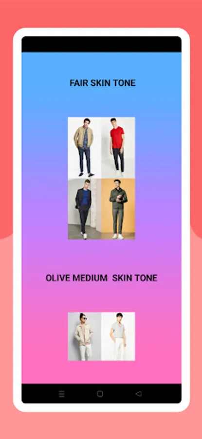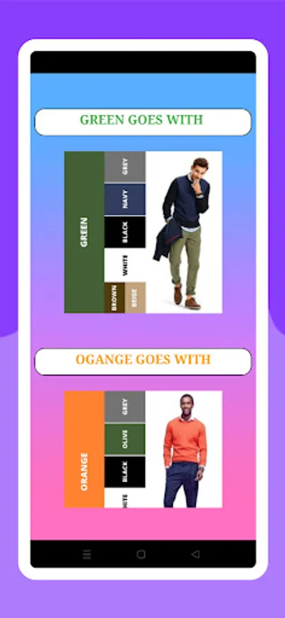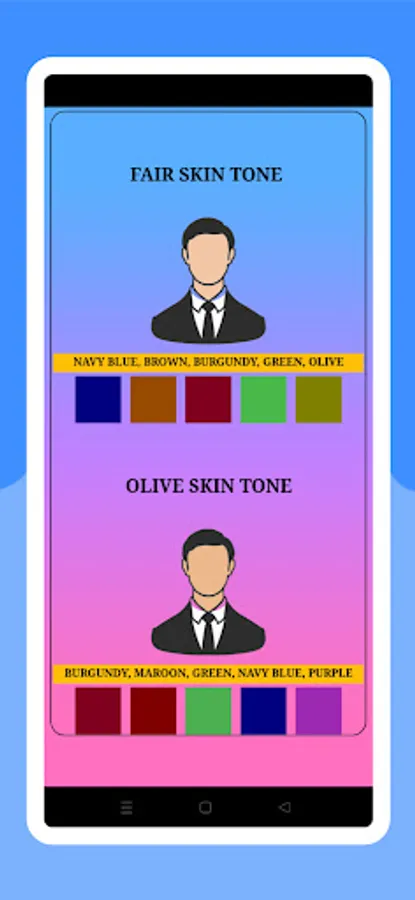 this app have colors of clothes by your skin tone. this app have color combinations for shirt and pants for man. you can choose clothes color by your skin tone. this app can guide you to dressing. it can improve your dressing. this app is dressing guide for men.