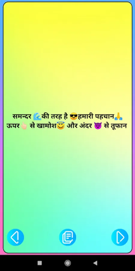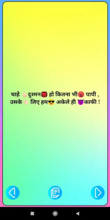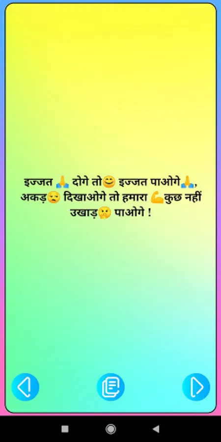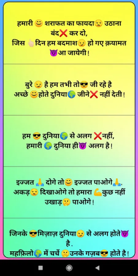 in this app there are lots of attitude status for boys if you love attitude status in hindi then this app is for you. this app have more than 500+ all attitude status for men you use this status in whats app face book and other social media sites.all attitude status are in hindi with emoji. all are new and fresh hindi attitude status.