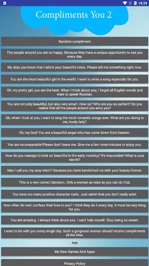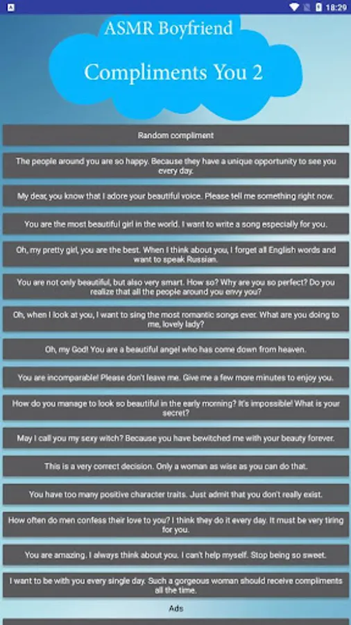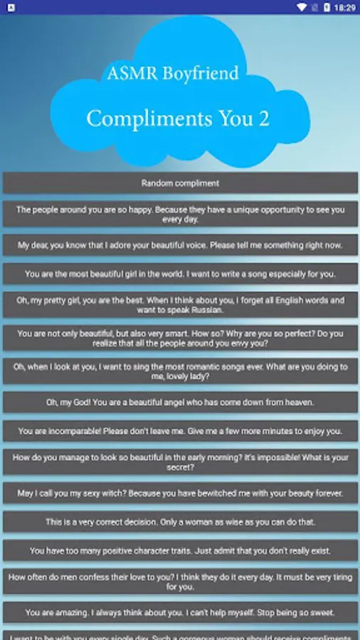 Do you want to receive compliments on a regular basis from a gentle, sweet, caring and adorable boyfriend? Then install this application right now. If you've tried the free version of this app, then you know how nice it is to receive compliments from this ASMR boyfriend with an unmatched Russian accent.