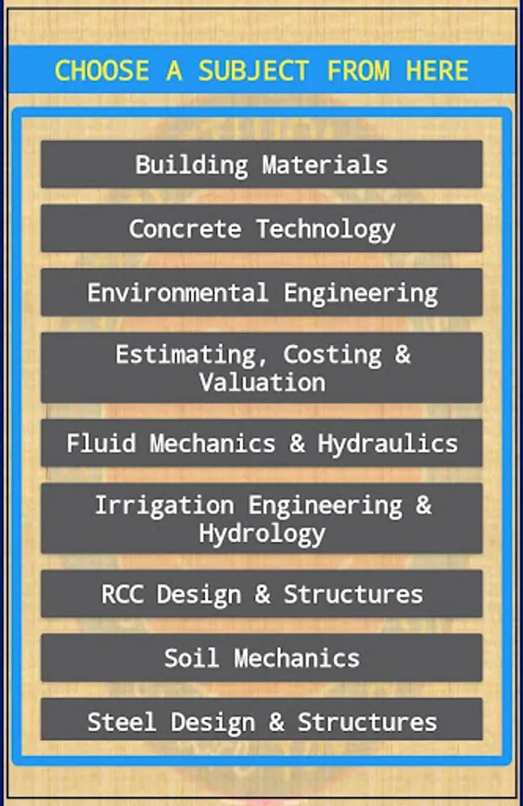More than ten core subjects of Civil Engineering like Building Materials, Concrete Technology, Environmental Engineering, Estimating, Costing and Valuation, Fluid Mechanics and Hydraulics, Irrigation Engineering and Hydrology, RCC Design & Structures, Geotechnical Engineering (Soil Mechanics), Steel Design and Structures, Structural Analysis, Surveying, Transportation Engineering (Highway and Railway Engineering), Water Resourses Engineering etc.