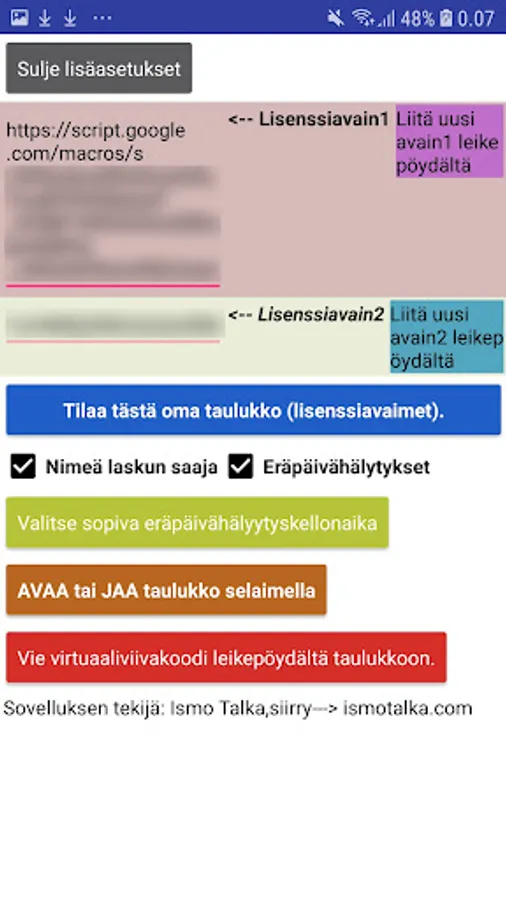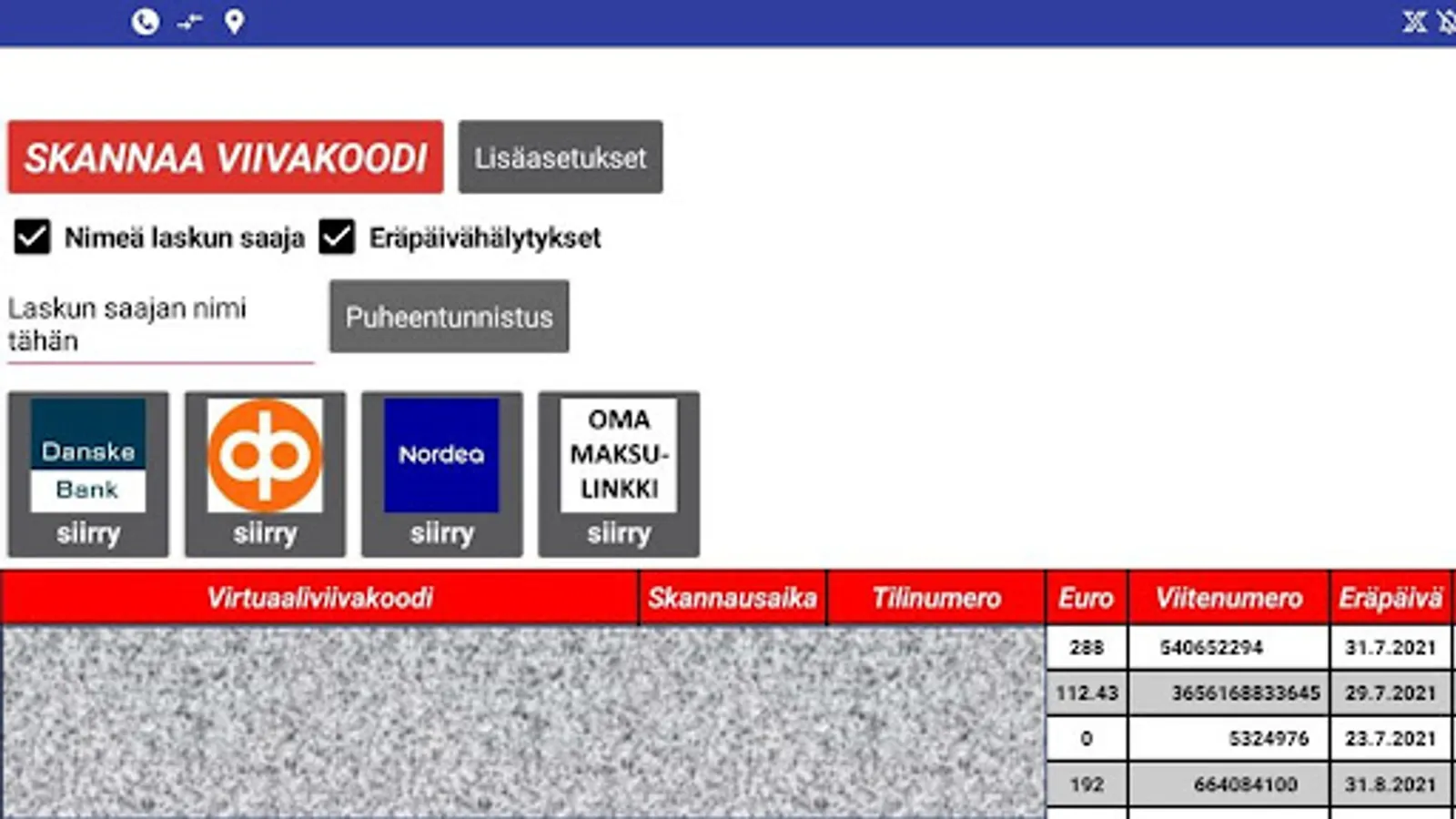Invoices can then be easily paid directly by copying the virtual barcode from the table and navigating to online banking with a browser. There are direct keys to the three largest online banks in Finland, and the user can save their own online banking link. All online banking connections are securely performed outside of the program by launching the Chrome browser. It is possible to transfer the virtual barcode to the browser via the Android clipboard. You connect it directly to your online bank.