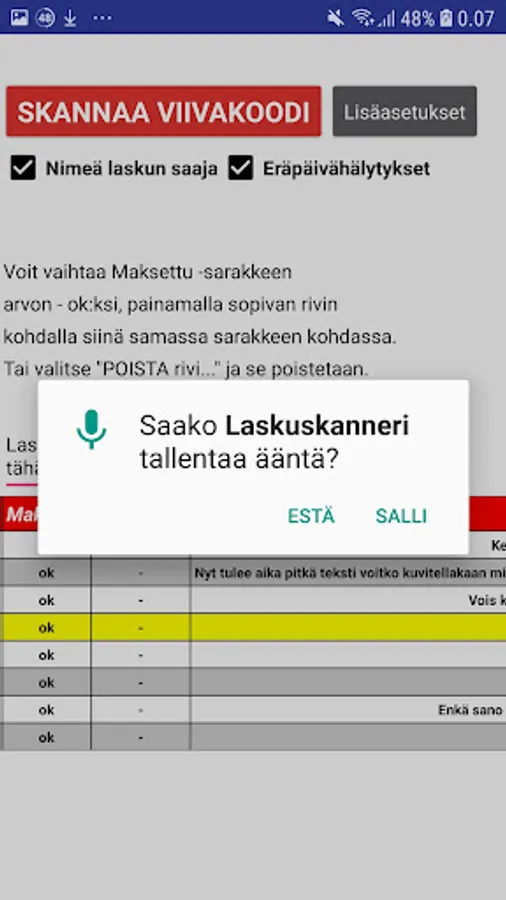 The name of the recipient of the invoice can either be typed, or speech recognition can be used. Speech recognition understands Finnish and makes it easy to avoid unnecessary and awkward typing on Android.