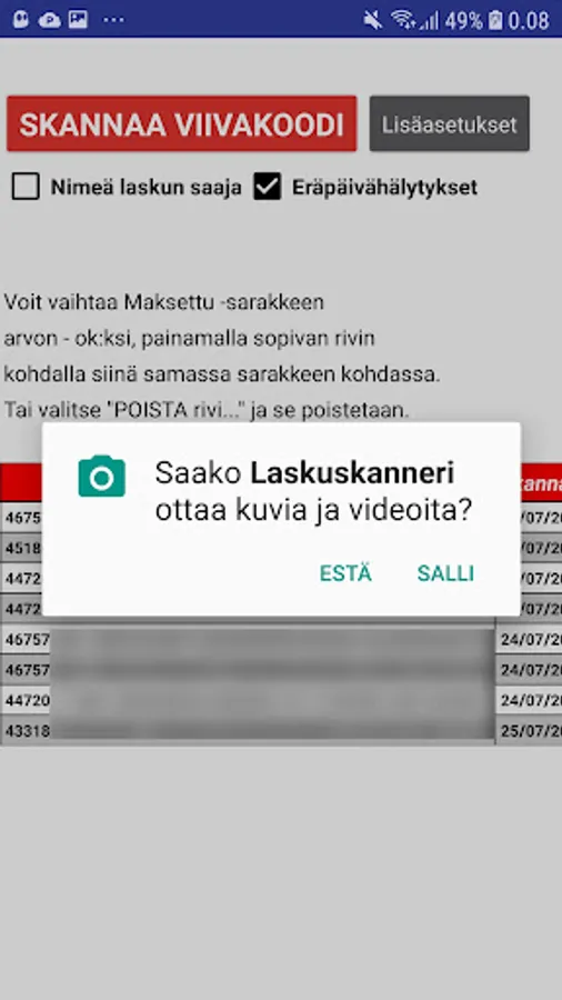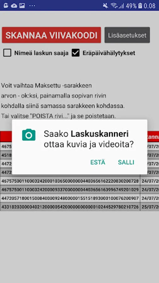 The virtual barcode allows all the information required for bank payments on the invoice to be obtained directly in tabular form and stored in the Google Spread Sheet. All information such as due date, invoice amount, account number and reference number is easy to copy directly to the Android clipboard.