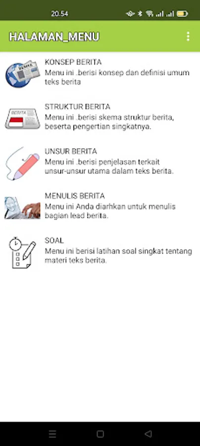 Aplikasi pembelajaran berita yang membantu siswa dalam mempelajari materi teks berita kelas VIII mata pelajaran bahasa Indonesia disertai latihan soal.