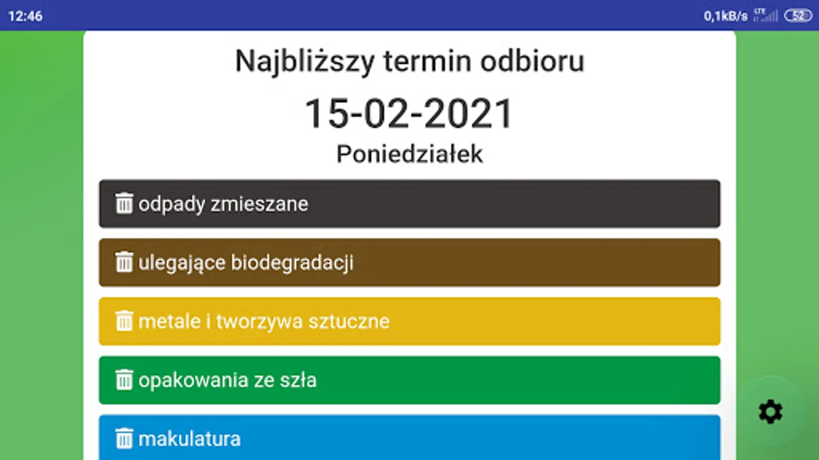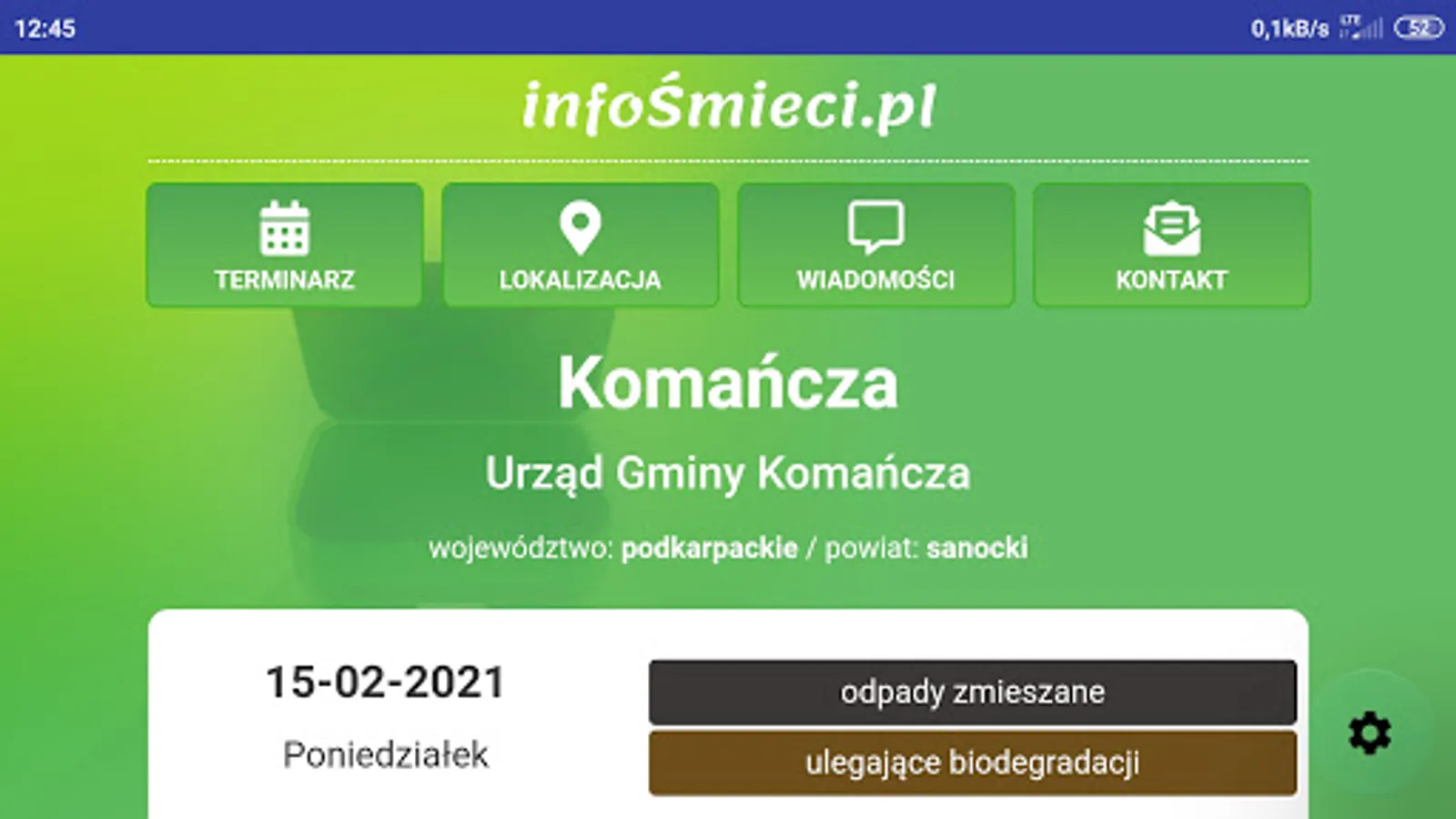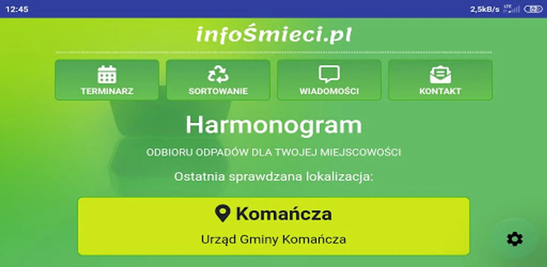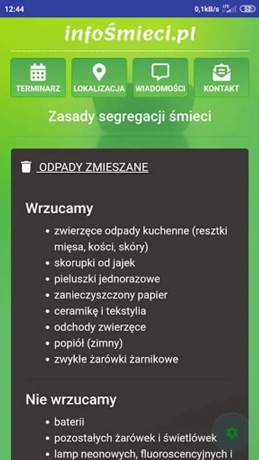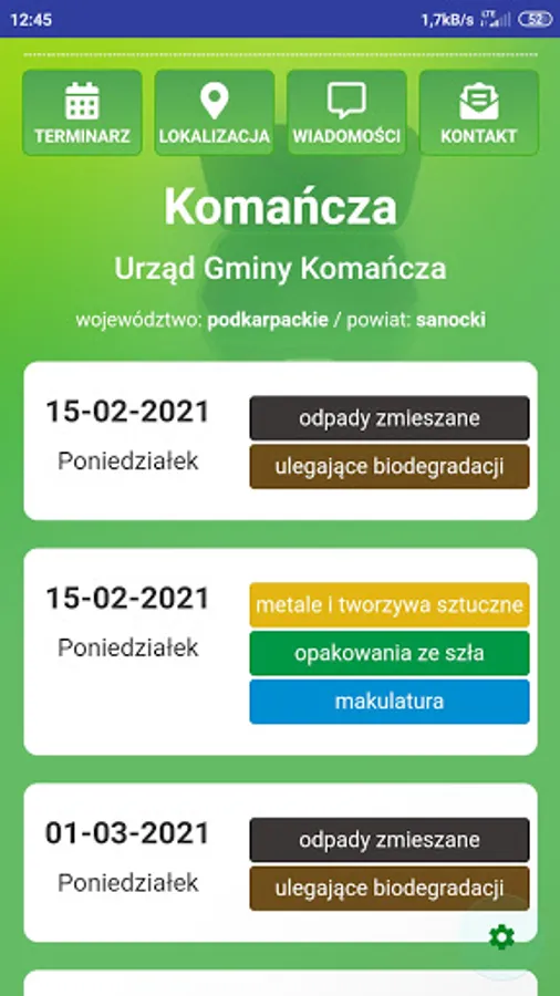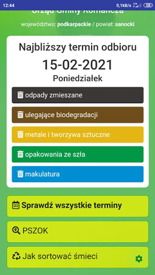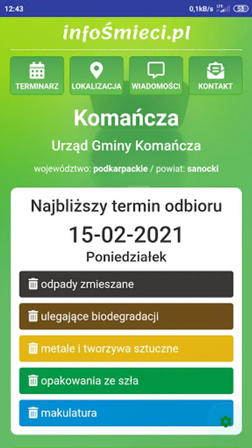 ATTENTION! Before installation, check at https://infosmieci.pl if the region is already supported. The application allows you to check the date of garbage collection broken down into different sorting methods. An additional option may be to turn on the notification a certain number of days in advance. Junk info is also the ability to send additional information to specific groups of users.