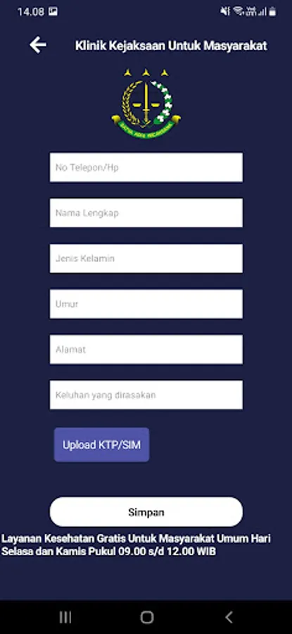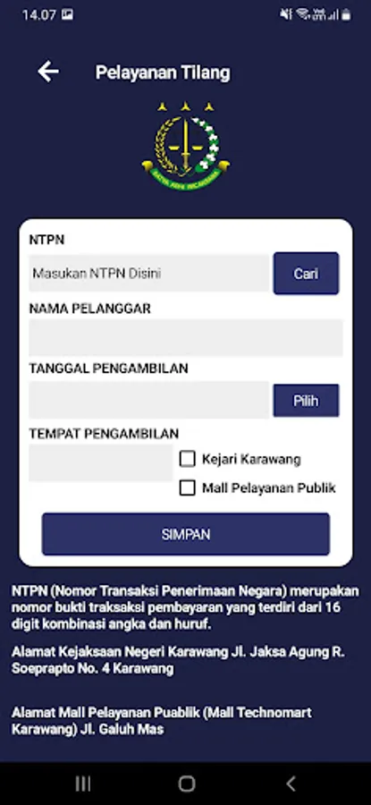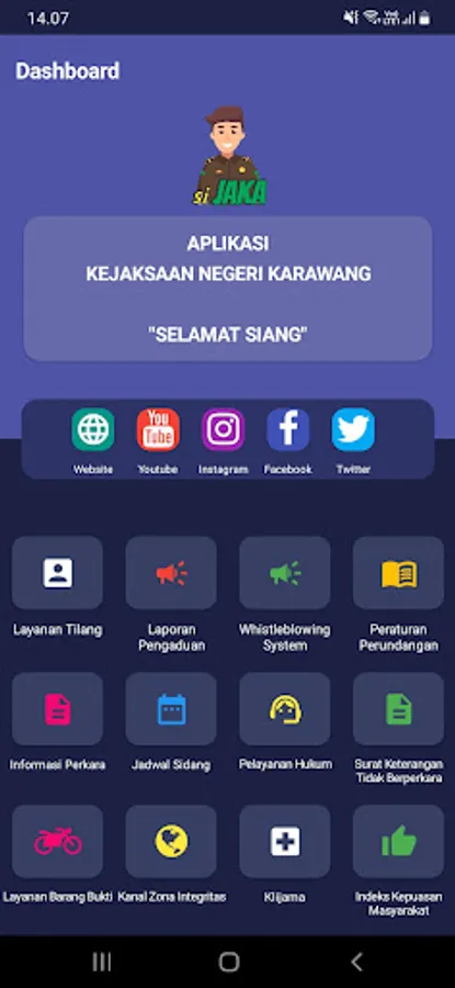The Karawang District Attorney's Office application contains E ticketing services, E Lapdu, WhistleBlowing System, a collection of laws and regulations, case information, trial schedule, free legal services, non-litigation certificate creation services, free evidence services, and free medical clinic services.