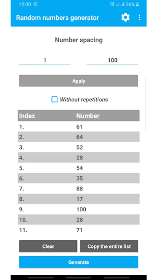 All generated random numbers will be added to the list. The random numbers in the list will be numbered and stored in your smartphone.
