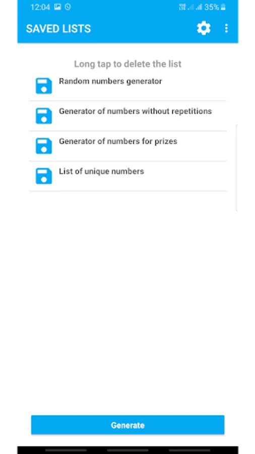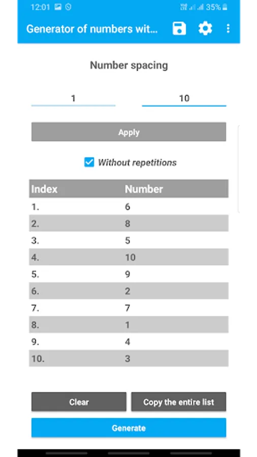 It's a simple random number generator app! This number generator is very simple and easy to use. To search for a random number, you need to select an interval and click "Generate". For your convenience, all random number variants will be added to the list. All lists of random numbers that have been created can be saved.