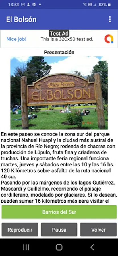 Excursion from the center of the city of Bariloche to El Bolsón and Lago Puelo. At each point of interest there is a short explanatory text and the possibility of listening to the explanation with the voice of the tour guide Mario Isla. After installed it does not require connection. Since there is no internet connection in many places, install before the ride.