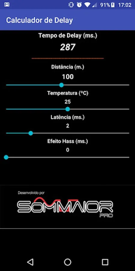 Application to calculate the delay time between sound towers, considering the distance, temperature, latency and Hass effect. The app calculates the time in milliseconds to be set on the manager.