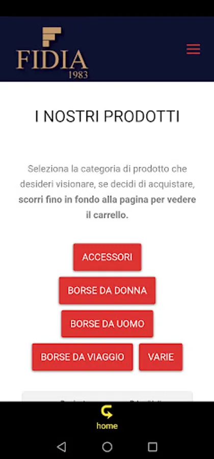 This app, in the final version, allows you to easily proceed with the purchase of FIDIA bags, which since 1983 has been producing and selecting the best of Italian leather goods. The app allows you to accumulate loyalty points, which can be used as a bonus for subsequent purchases.