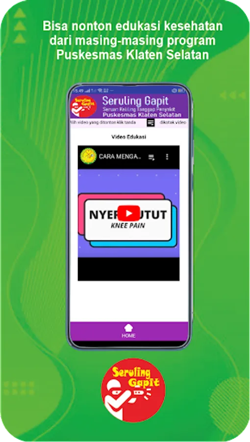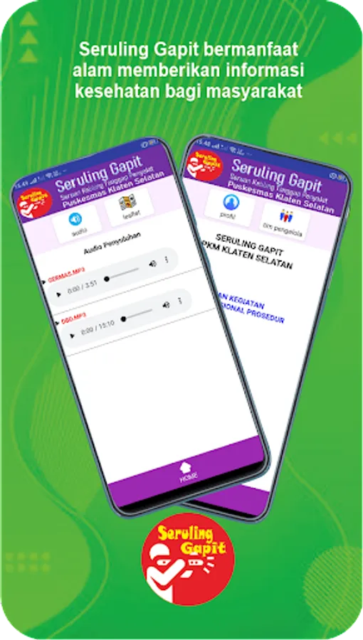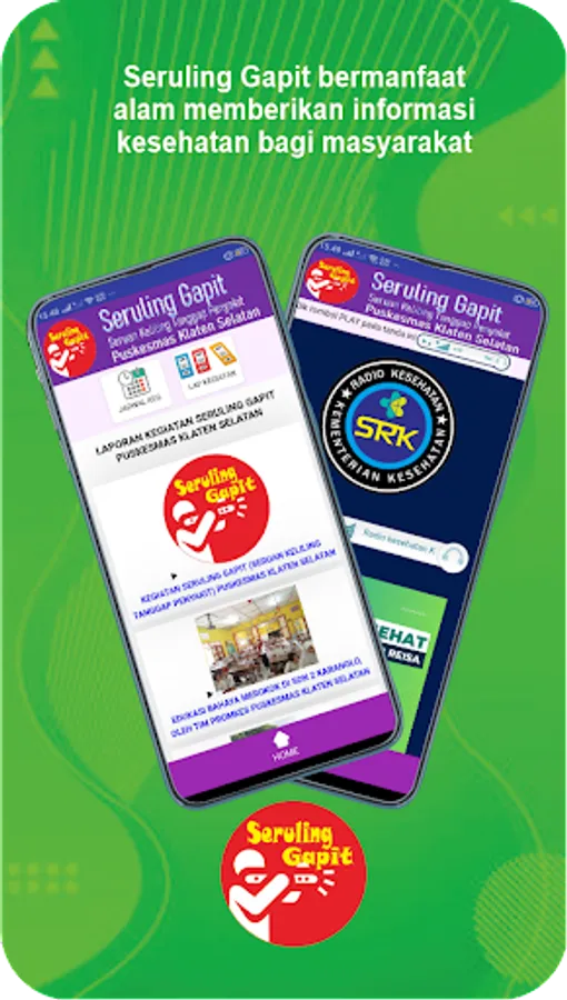 Seruling Gapit is an abbreviation for Disease Response Mobile Call which was developed independently by the South Klaten District Public Health Center Health Promkes Team. Klaten. In the version 1.0.2 application, there are additional menus that are useful for health education for the public. Additional menus include website, incident report page, Instagram, WA chat, Ministry of Health online radio and BPJS chat