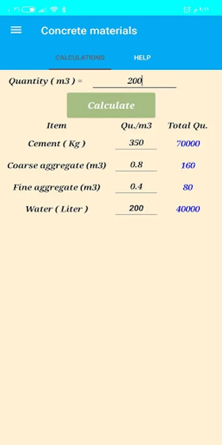 2 - Calculate concrete materials ( Cement , Fine aggregate , Coarse aggregate & Water content ).