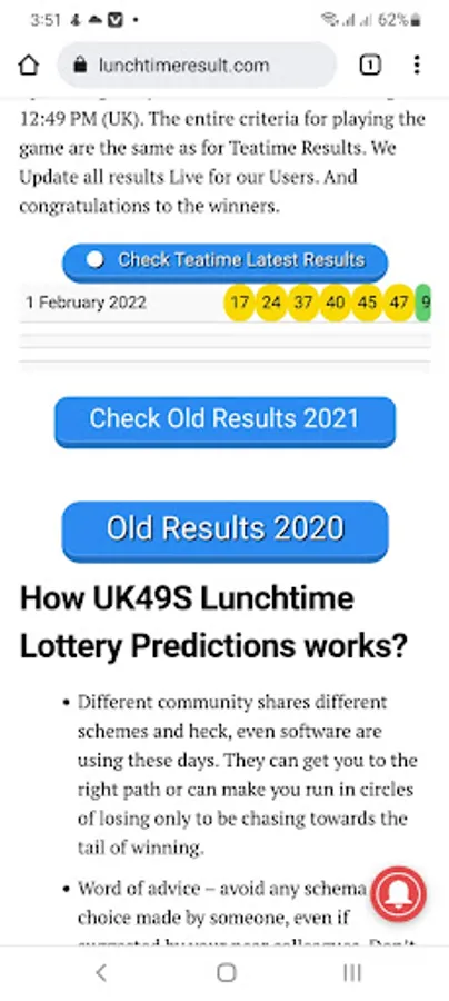 Lunchtime results update the latest lunchtime and teatime results directly to your device. You can select your favorite draw and it will notify you as the results are announced.