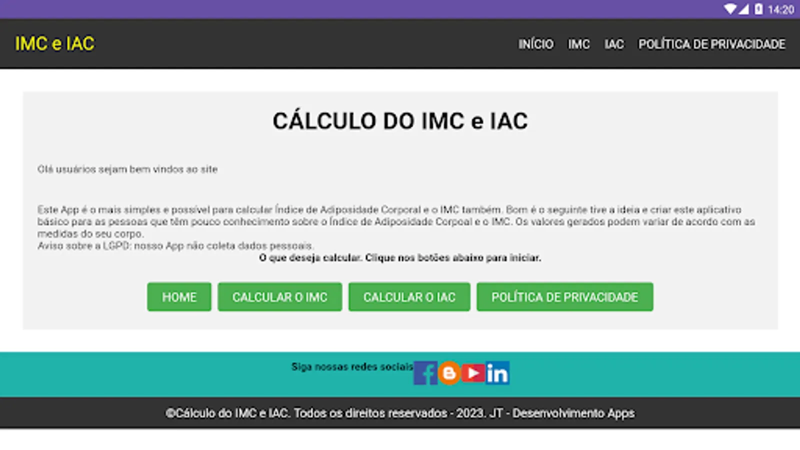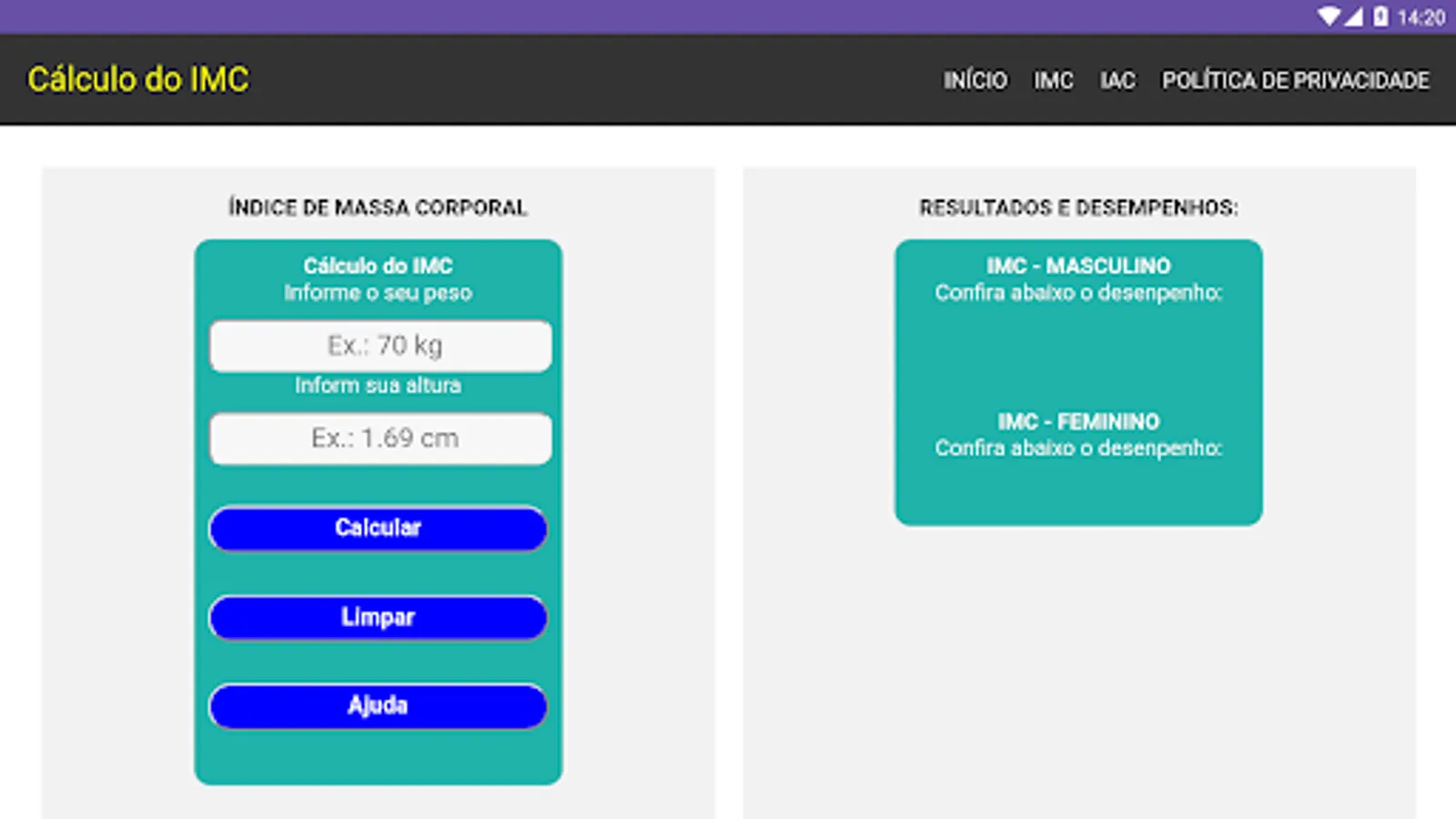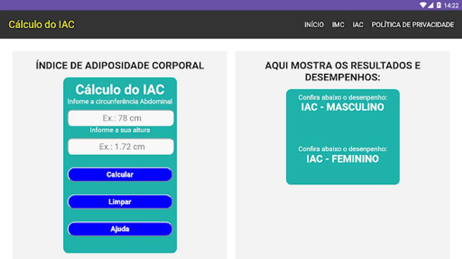 This app calculates a person's body adiposity index (BFI) according to their height and hip circumference. With it you can calculate your IAC and BMI, that is, you know if you are above your ideal weight.