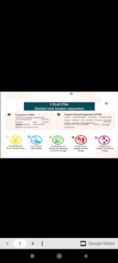 The Five Pillars of STBM are indicators of community assessment, namely Stop Opening Open defecation (Stop Open defecation), Washing Hands with Soap, Safe Management of Drinking Water and Household Food, Safe Household Waste Safeguarding and Safe Household Liquid Waste.