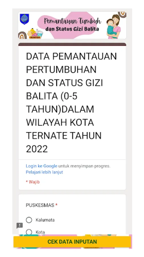 This application is used to track the nutritional growth of toddlers aged 0-5 years in the City of Ternate in 2022. This application is used by puskesmas officers in the working area of the city of Ternate in an effort to accelerate the implementation of online data collection and can view and download the results of the data collection directly through the application. . This application also has an educational feature that can assist officers in conducting health education and for the public to obtain education independently through the application.