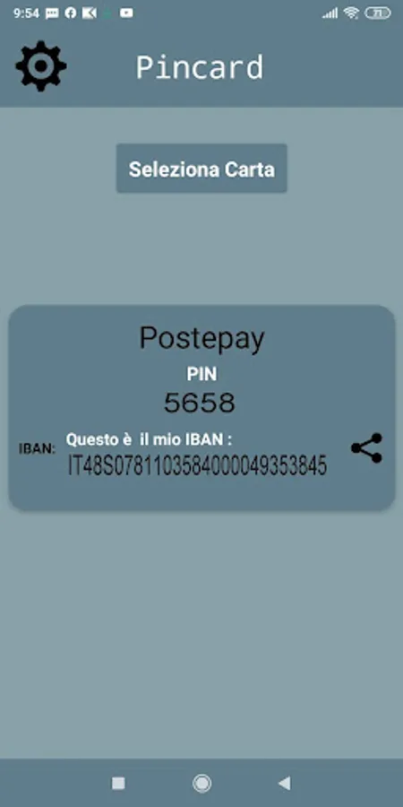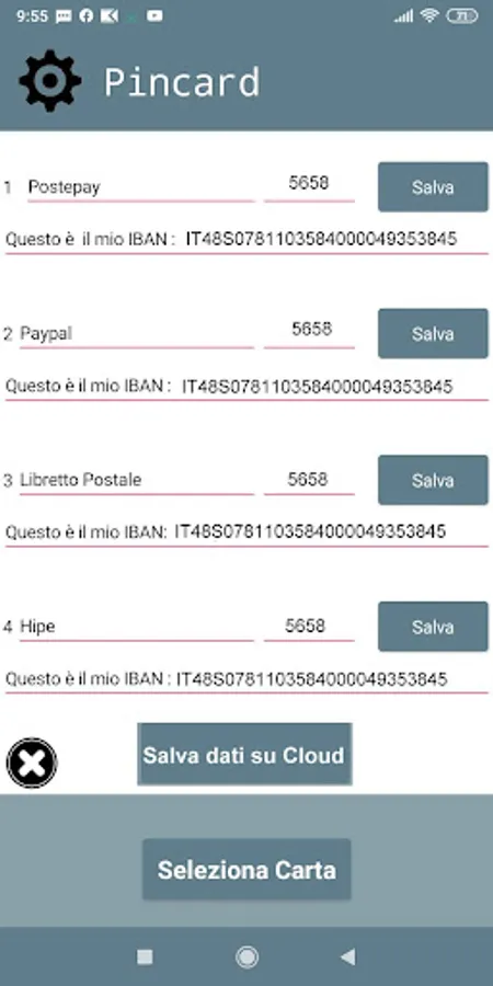 Pin insertion max 4 credit cards, IBAN insertion and sharing (optional).