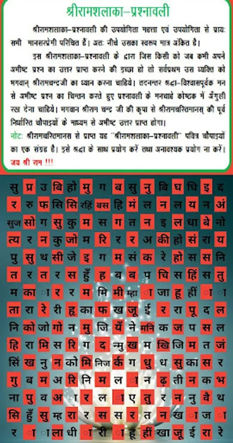 'Shriram Shalaka' is a wonderful app based on the sacred chaupai of 'Shri Ramacharitmanas' composed by Goswami Tulsidas.