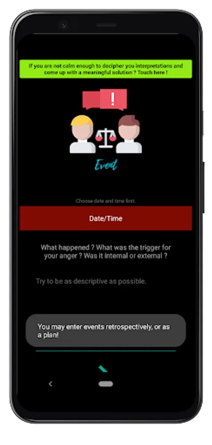 7)The evaluate and act section includes the anger journal. The anger journal will help resolve the thoughts that are leading to anger. This section will also serve as an anger diary which you can review anytime.