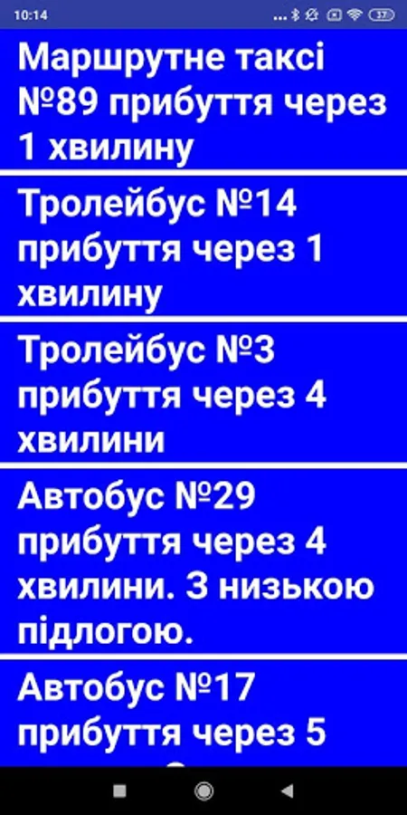 - at the selected stop to find out the forecast of transport arrival. If the vehicle is going to a stop with a low floor - this will be reflected in the forecast. The forecast is sorted by the arrival of transport - ie the same route can be several times in the forecast list;