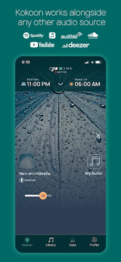 Use audio from any audio app - e.g. Audible, Spotify, Podcasts etc. It works with whatever you like to listen to when relaxing.