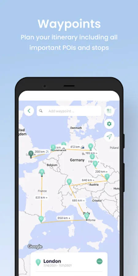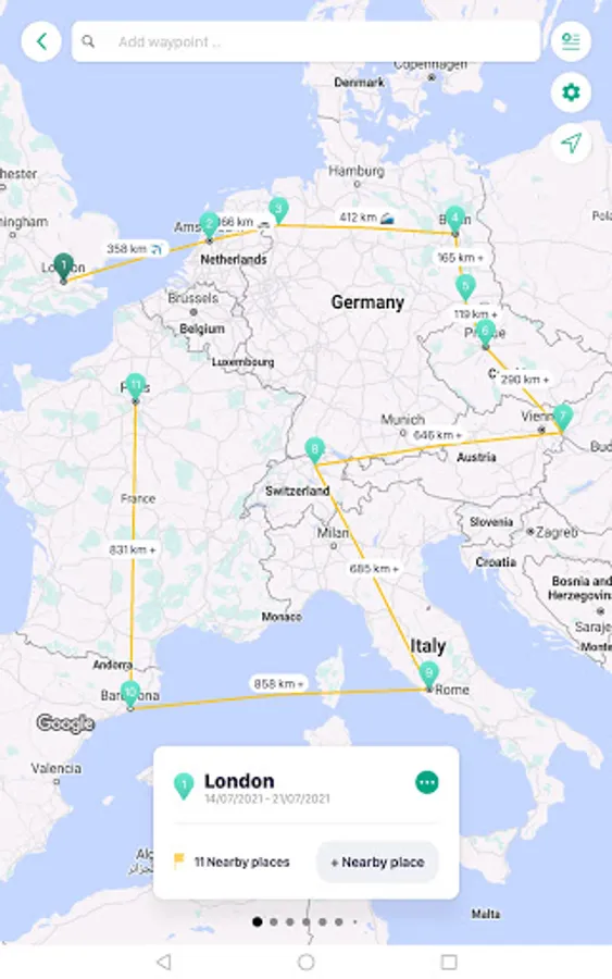 So much world, so little time! That's why we've made itinerary planning as easy as possible. Mark your destinations as stops and add interesting places effortlessly. Want to change something? No problem! Move or delete your stops in a snap. Planning your trip has never been so easy!