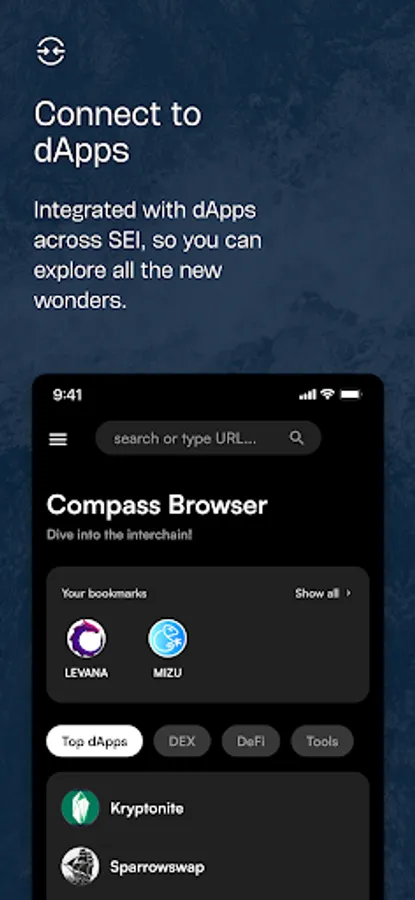 Seamlessly explore SEI networks and dApps like Levana, Sparrowswap, Fuzio, Kryptonite, Sensei, and more.