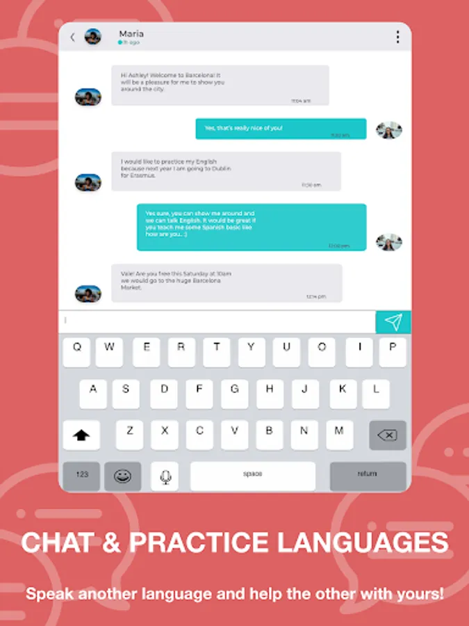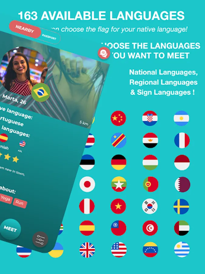 With Leeve you can practice, learn and meet English, Japanese, Spanish, German, Chinese, Vietnamese, Portuguese, Arabic, Polish, Italian, Russian, Korean nearby or with people all around the world!