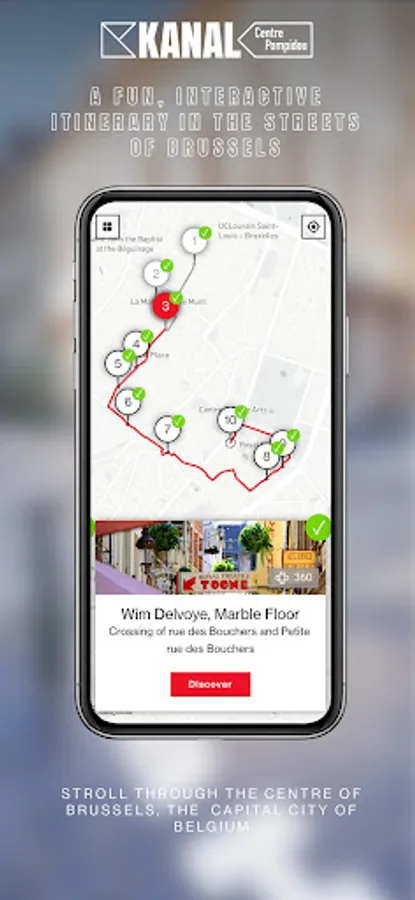 The app proposes a mixed-reality experience to prolong the temporary exhibition, in the form of an urban itinerary around nine emblematic venues in Brussels associating 360° interactive panoramas, famous works of contemporary art, and original stories!