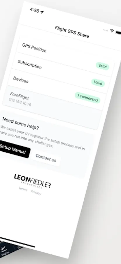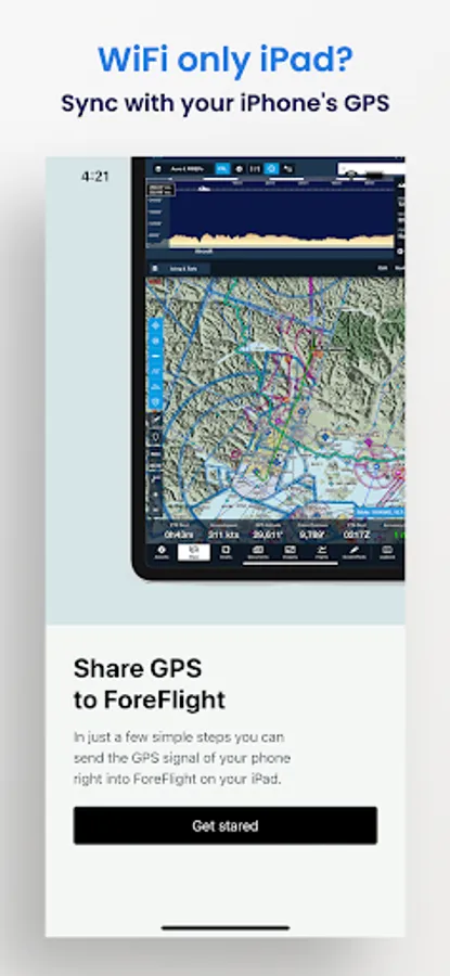 Flight GPS has a super easy setup. Simply connect both of your devices to the same Wi-Fi or hotspot, start Flight GPS, open Foreflight, watch them automatically sync up, and you are ready for takeoff!