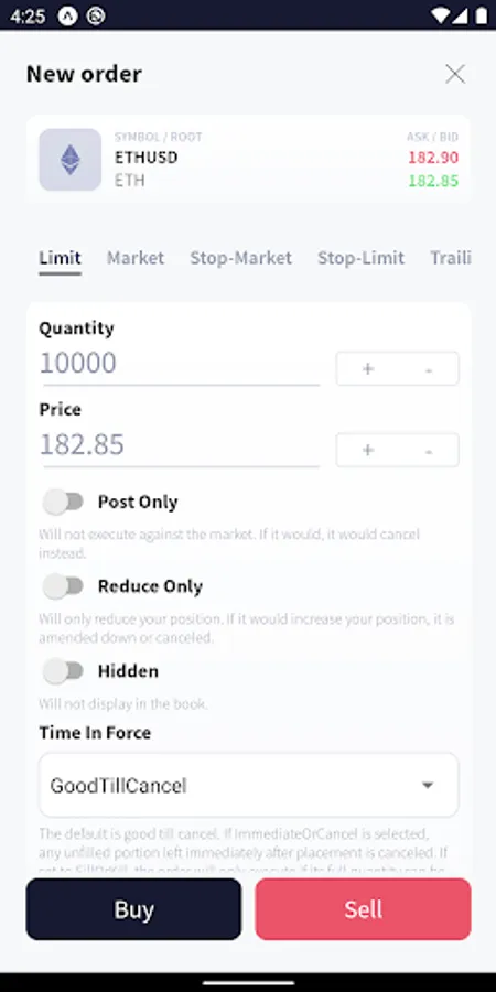 Buy/long or sell/short every market available on BitMEX using Limit, Market, Stop ( Market/Limit), Take Profit (Market/Limit) or Trailing Stop orders.
