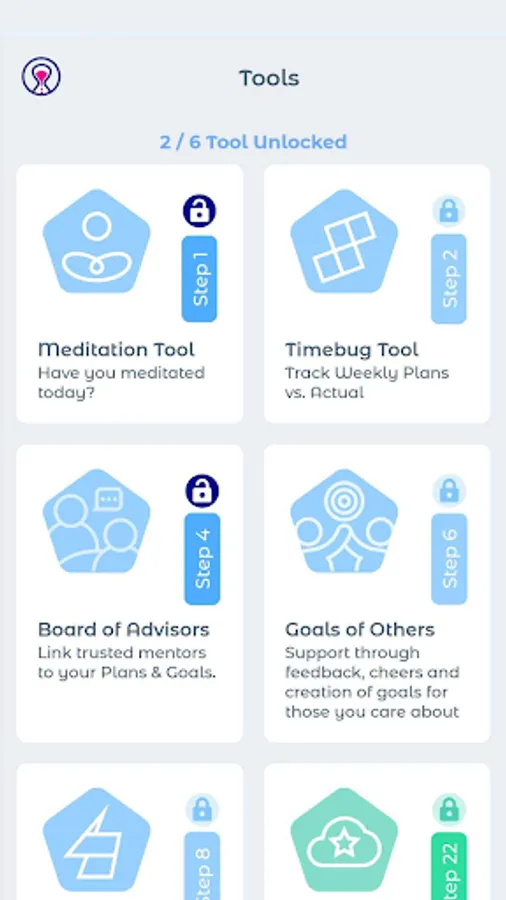 Users unlock special Tools to help with meditation, goal tracking and time management as they complete Steps in the Journey tab. Daily & Weekly Check-Ins facilitate self-awareness, and optimize Energy levels throughout the week. Manage Vision Boards that can act as Intentions, reminders or motivational notes for different periods of time - Day, Week or Month. Share your Goals with others, including Advisors. Connect socially with others to see what Goals they're working on and support them with comments, cheers and advice.