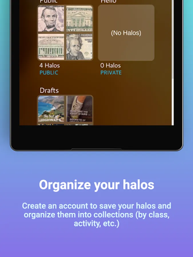 Ready to share the epic halos you’ve created with your students, or the world? First, create an account to save your halos and organize them into collections (by class, activity, etc.). Then, anyone who follows your collections will see your halos appear magically before their eyes.