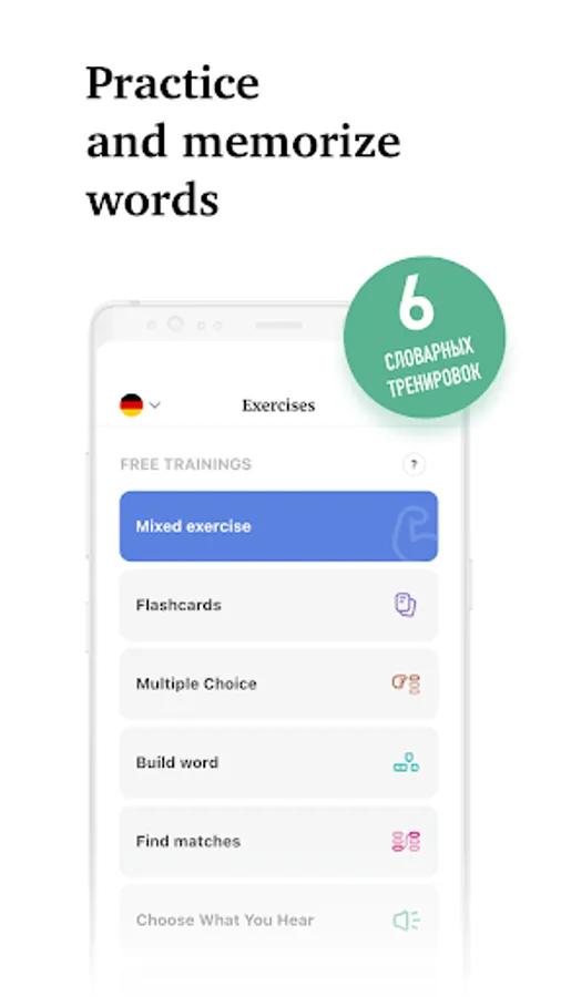It is well known that to quickly remember new words, they need to be seen several times. The application has everything you need to speed up the progress of memorization: