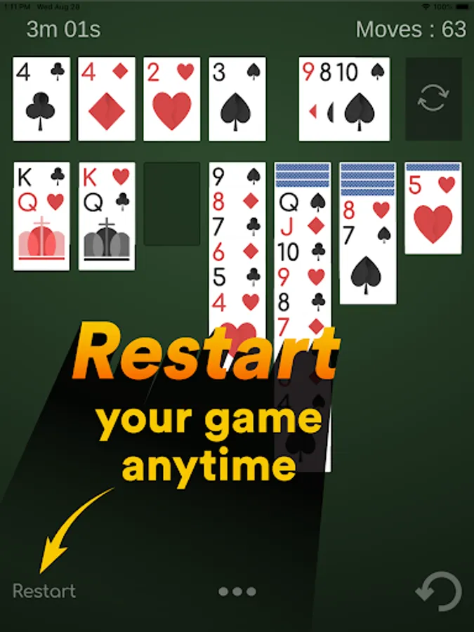 Tap or drag cards to arrange them in descending order with alternating colors. When you can, move cards up to the foundation to sort all of the suits from Ace to King. You can draw one card at a time for a more relaxing game, or draw three for a challenge to train your brain!