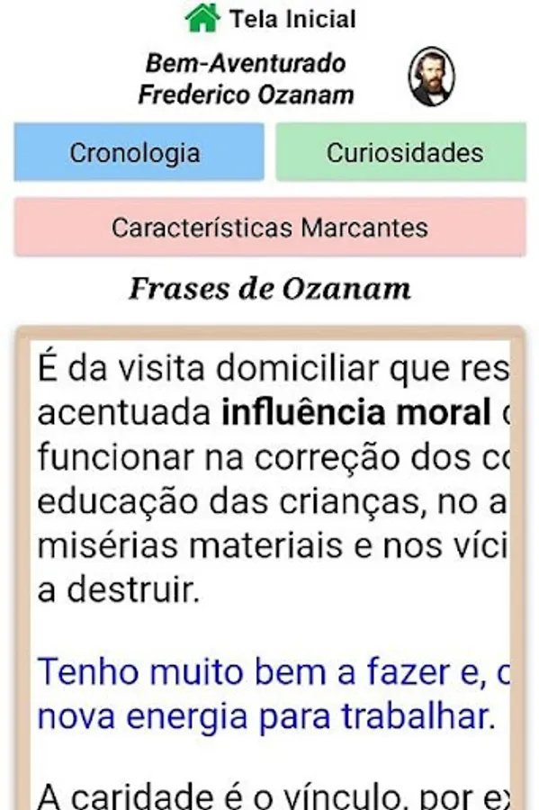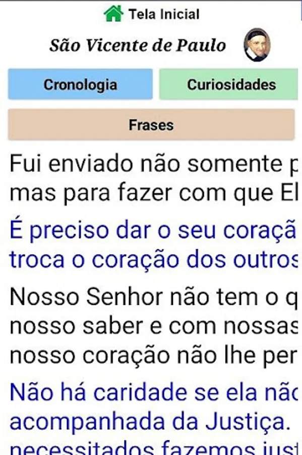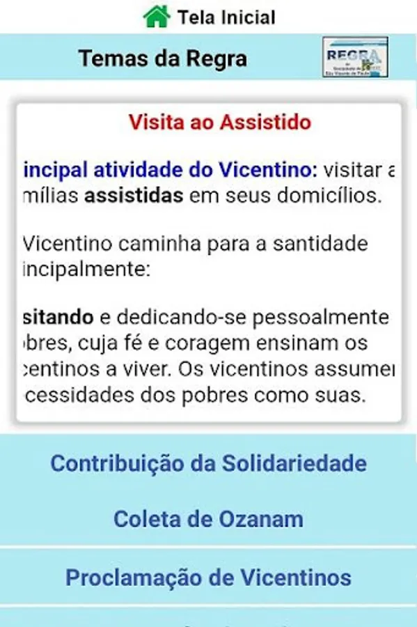 Panel Vicentino is a Consultation Application, especially for the Vincentians of the SSVP. There are six sections with Vincentian themes: On Ozanam (phrases, chronology, striking features and curiosities); About São Vicente de Paulo (phrases, chronology and curiosities); About the SSVP (various topics); Themes of the Rule; "Quiz" to test your knowledge; and Vincentian Conferences in Brazil.