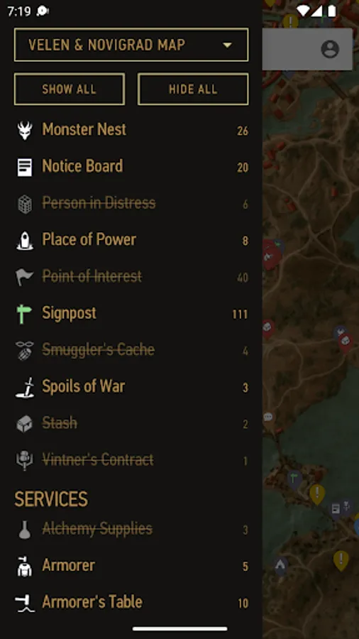 • Maps for every region (including DLC) - White Orchard, Velen & Novigrad, Skellige Isles, Kaer Morhen, Toussaint, Fablesphere & The Isle of Mists