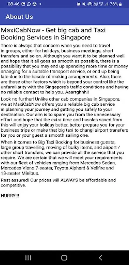 Look no further! Unlike other cab companies in Singapore, we at MaxiCabNow offer you a reliable big cab service for planning your journey and getting you safely to your destination. Our aim is to spare you from unnecessary effort and hope that the extra time and hassles saved from this will enjoy your holiday better, better prepare you for your business trips, or make that big taxi to change airport transfers for you or your guest a smooth sailing one.