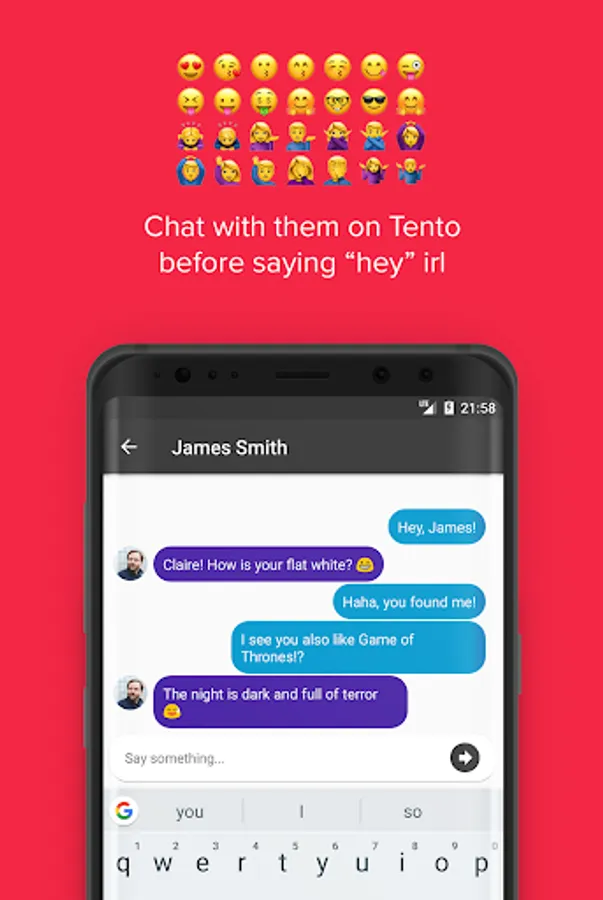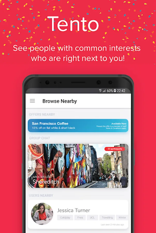In this version, youโll be able to see people around you and make connections in real-life. You'll be matched with relevant people based on your interests (and you can chat on Tento before saying "Hi!" in real life). More to come soon!
