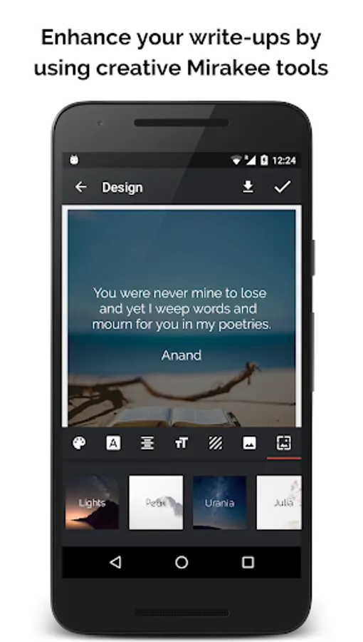 Use designing tools for greater visual impact. Build meaningful color relationships to create visually stunning posts, use eye-catching images and beautiful fonts. Add words to pictures and bring them to life. We bring art and writing together. You'll find that Miraquill is one of the best quotes creator app in the market.