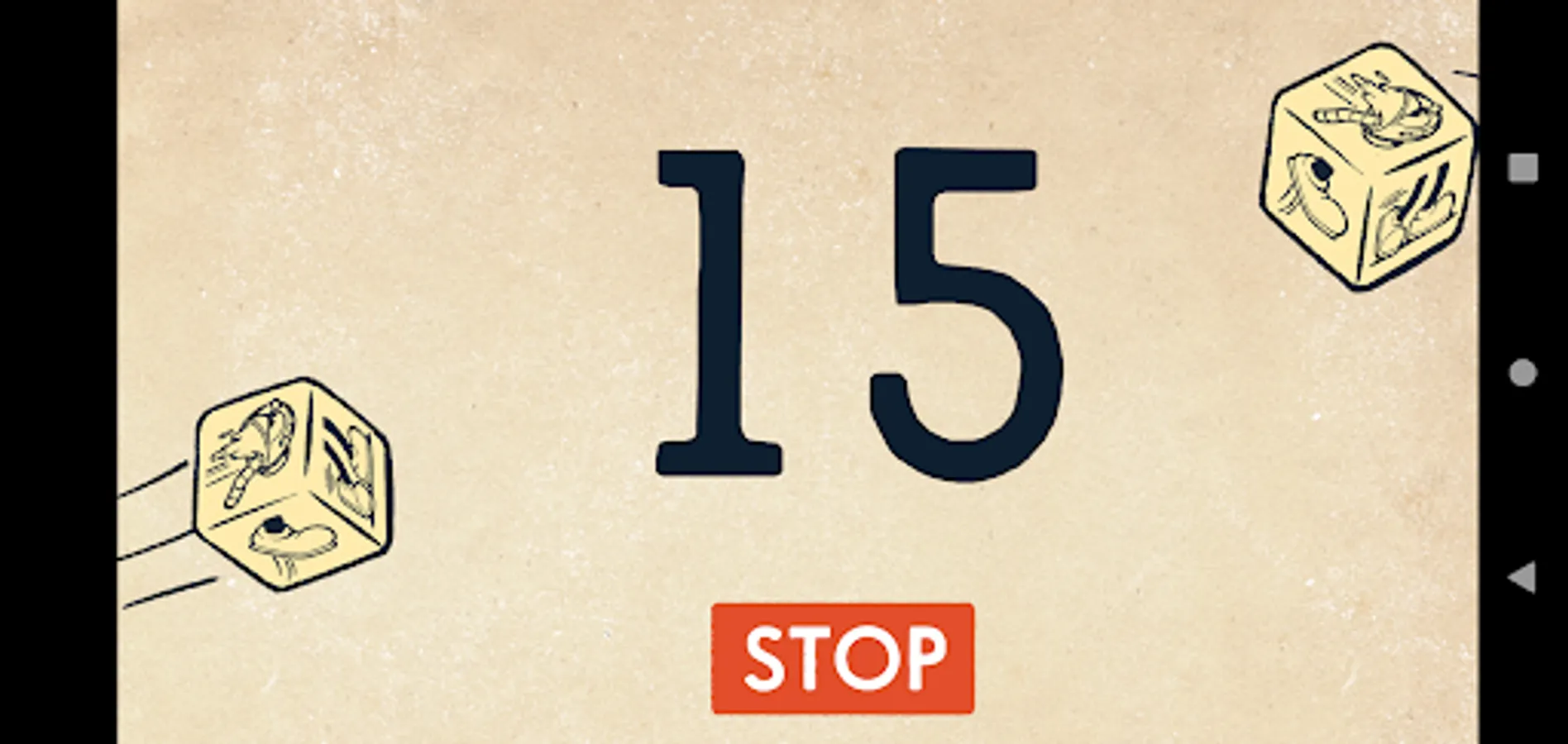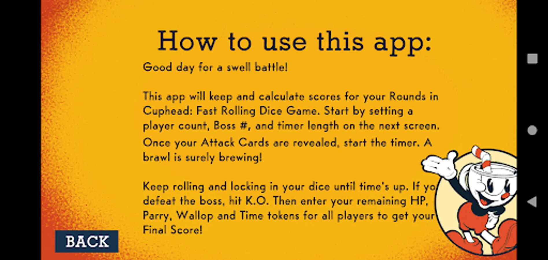 Choose the length of your rounds: 10 second, 15 seconds or 20 seconds and hit START. The app will count down your round while you feverishly roll the dice. Keep rolling and locking in your dice until time’s up. If you defeat the boss, hit K.O. Then enter your remaining HP, Parry, Wallop, and Time tokens for all players to get your final Grade!