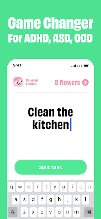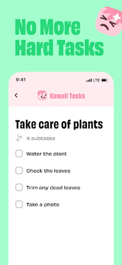 Breakdown your todos with Kawaii tasks. Tackle tasks you've been delaying by getting small, manageable subtasks.