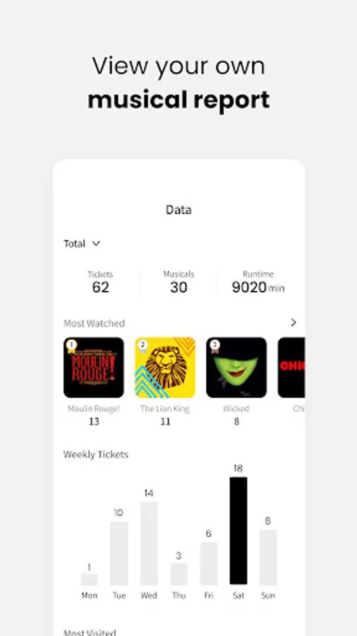 Analyzing your whole musical life for days, months, and years. You can get insight of your most watched musical, most visited theatre, weekly musicals, and your spendings