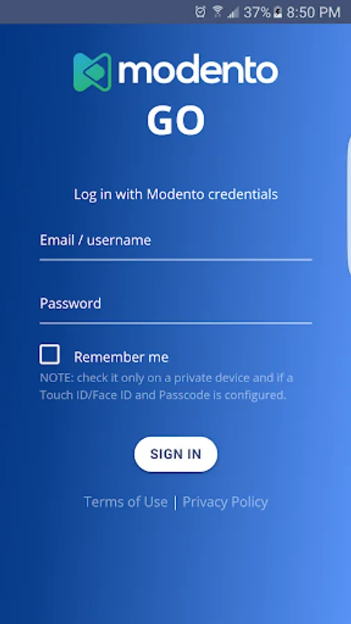 NOTE: You will be able to log in to the application only if you have an active user account for Modento Dashboard.