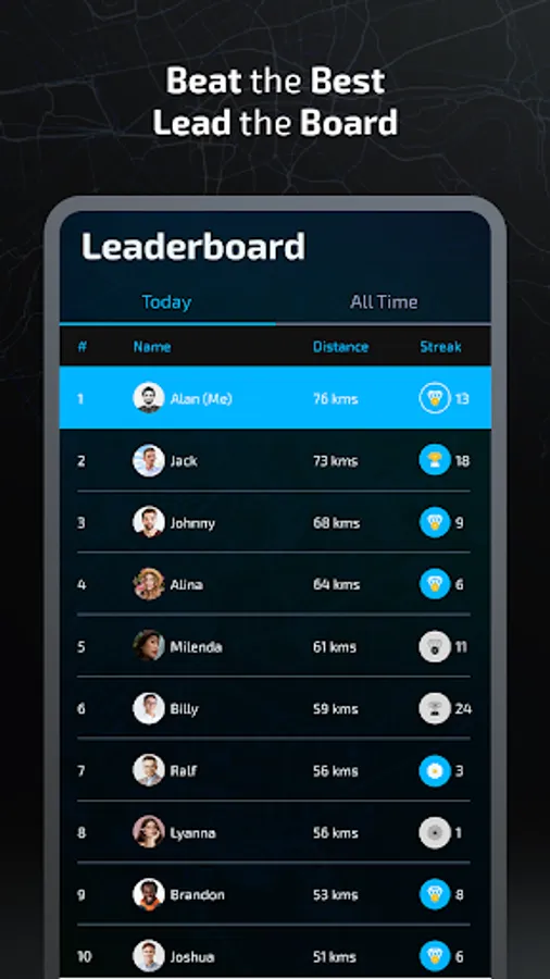 • Leaderboard lets you compete with other Saigon users. Set up a competition with your peers and see who cycles the most!